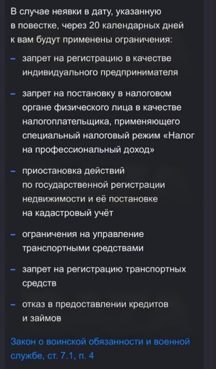 — Допмеры по закону вводятся через 20 календарных дней от даты, указанной в повестке (СМИ часто упрощают это как «27 дней» от момента уведомления). Перечень мер: запрет на регистрацию ИП и самозанятости, ограничение права управления авто, приостановка кадастровой постановки/регистрации прав на недвижимость, запрет регистрации ТС, отказ в кредитах.