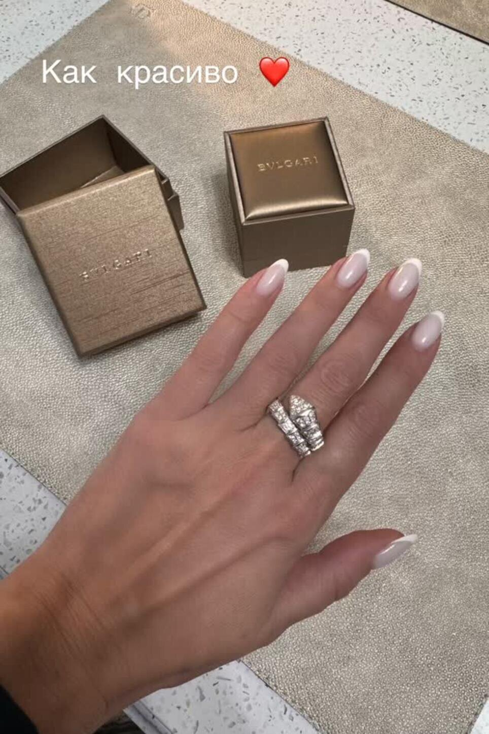 Речь об украшении «известного бренда». По визуальным признакам форма и «змеиная» стилистика напоминают линейку Serpenti ювелирного дома Bvlgari; в открытом каталоге бренда есть схожие модели с бриллиантовым паве. Примерная стоимость кольца составляет 1,5 миллиона рублей.