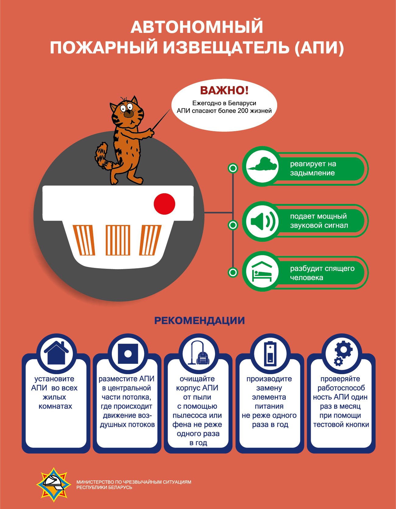 Поставьте автономные дымовые извещатели на каждом уровне дома и у выхода из спален. Раз в месяц — тест, раз в год — новая батарейка (или модели с 10-летним элементом). Для частного дома с печью: чистка и проверка дымохода перед сезоном.